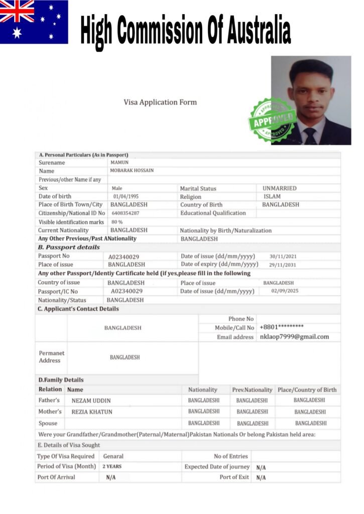 A02340029 Name:Mobarak Hossain Mamun Nationality: Bangladeshi Company: Rts Gender: Male Status: Processing Applying Country: Australia Application From Work Permit